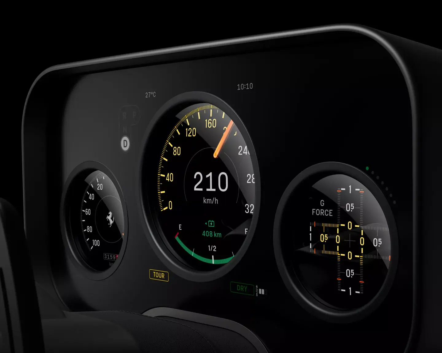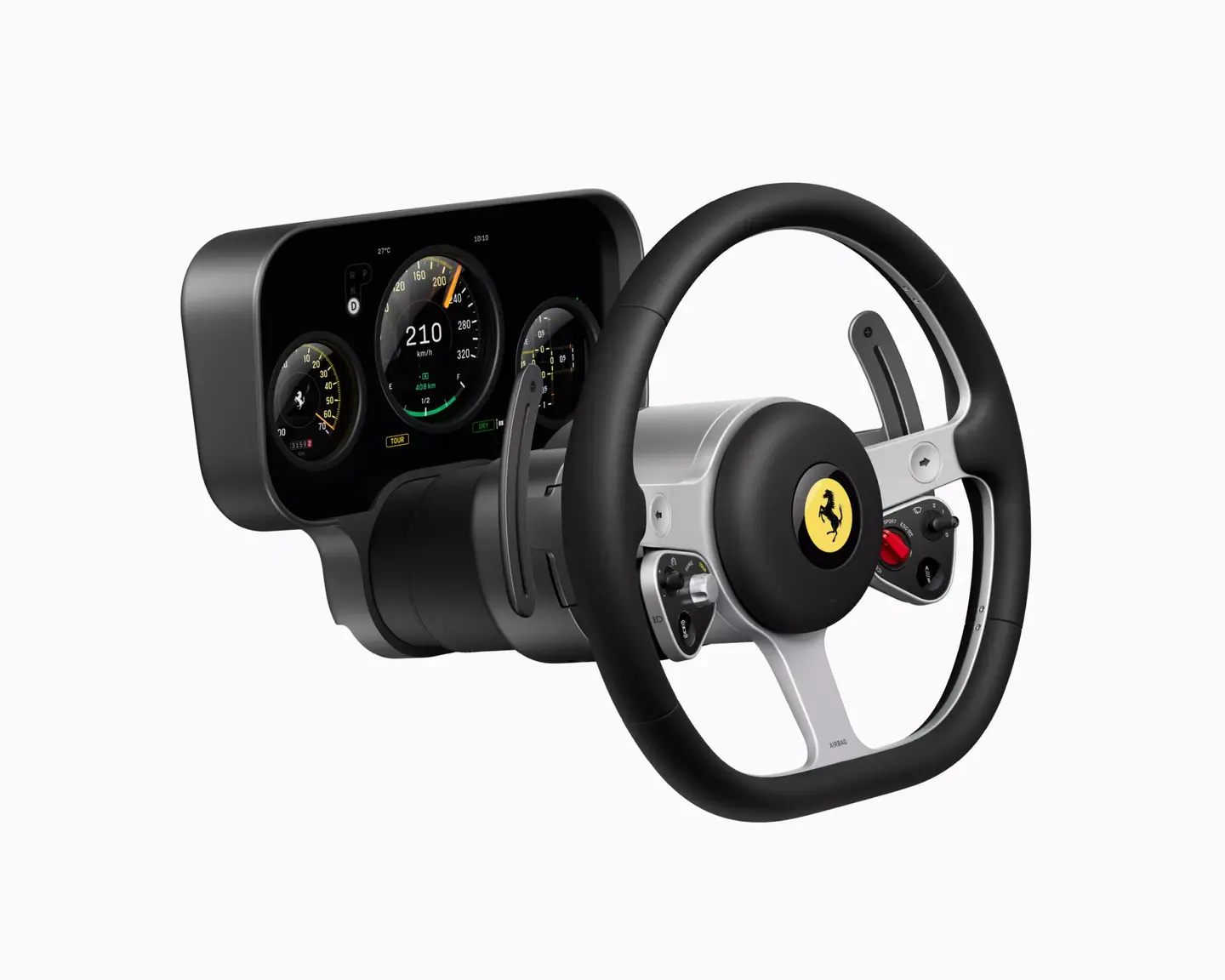 Ratin takana majaileva mittaristo on puolestaan kehitetty yhteistyössä Samsung Displayn kanssa. Siinä hyödynnetään kahta huippuohutta OLED-paneelia, jotka luovat lähes analogisen mittariston kaltaisen syvyysvaikutelman. Oranssi neula on puolestaan aito analoginen asia, ja mittariston fontit luovat mielleyhtymiä sekä ilmailun maailmaan että klassisten Ferrarien Veglian tai Jaegerin mittareihin.