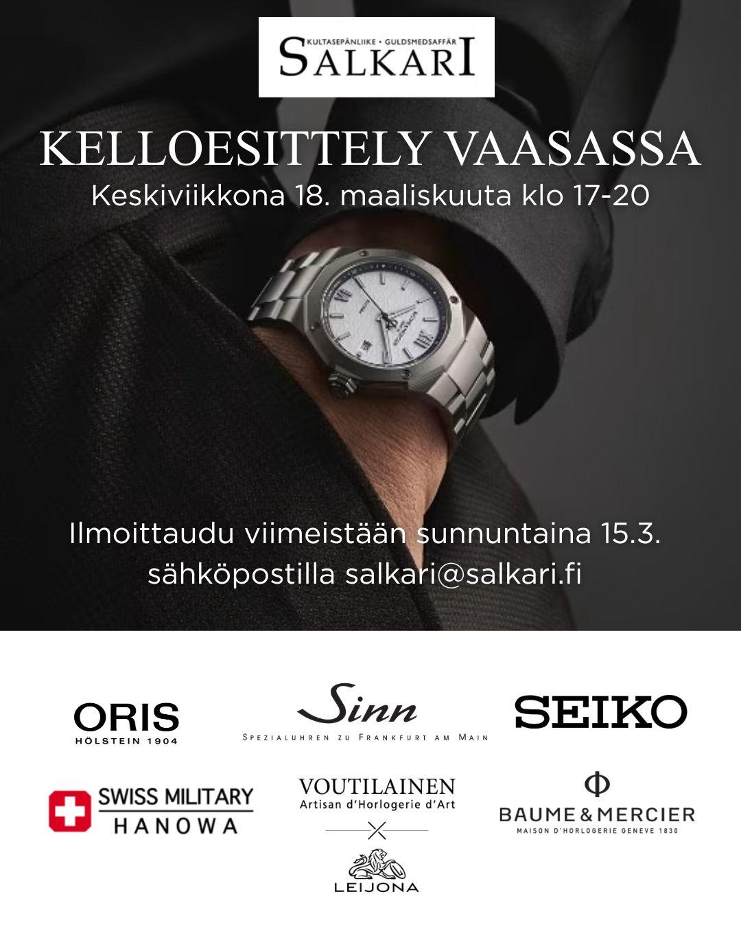 Vaasassa Kauppakeskus Rewellin toisessa kerroksessa myymäläänsä pitävä Salkari järjestää keskiviikkona 18. maaliskuuta kello 17-20 välisenä aikana kellotapahtuman, jossa pääosassa ovat Baume & Mercier, Seiko, Sinn, Voutilainen x Leijona Heritage, sekä Oris ja Swiss Military Hanowa. Kellomerkkien edustajia tulee paikalle mm. Norjasta, Saksasta ja Lahdesta.