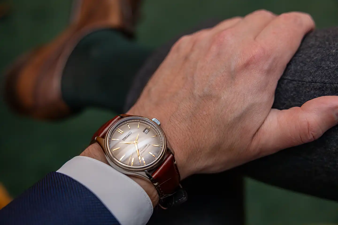 Pukeutumisen ystävänä tervehdin ilolla japanilaisen Seikon uutta Shiracha-lempinimen saanutta Presage Classic Series SPB529 -kelloa, joka on esteettinen ja funktionaalinen asuste, rehellinen pukukello. Ajatustani tukee japanilaisen kengänvalmistaja Regalin ylijäämänahkoista kelloihin valmistetut rannekkeet, jotka korostavat hienovaraisesti pukujen ja klassisten nahkakenkien yhteenkuuluvuutta valkoisten tennarien hyökyaaltoa vastaan.